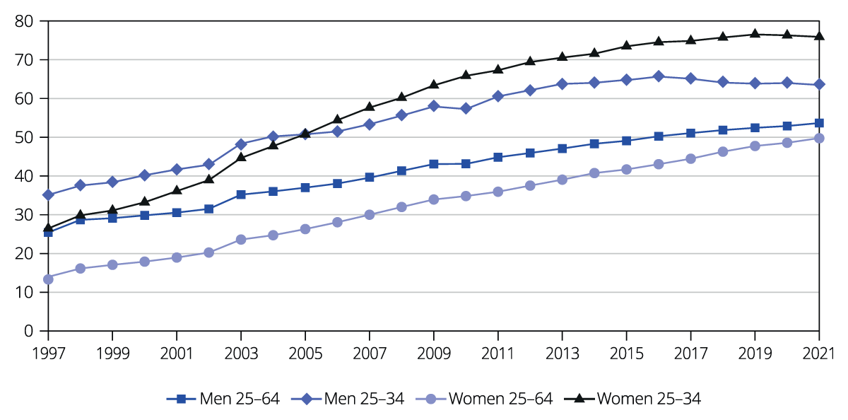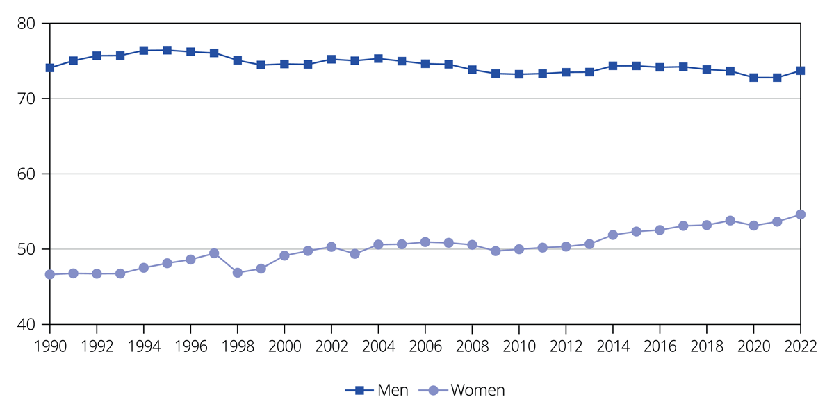 Reflecting sharply defined gender roles in traditional Korean society, women have long experienced substantial occupational and industrial segregation, lower earnings than men even when doing similar jobs, and fewer opportunities for promotion (Patterson and Benuyenah 2021). Given the implied high levels of gender disparity, a gender perspective might anticipate that the wage gap will be reinforced by similar differentials in favour of men with respect to all or most dimensions of job quality. Stier and Yaish (2014), for example, find that most men do better than women in respect of five out of six aspects of job quality across 27 countries,3 although Green (2021) finds a more mixed picture in Europe. To the extent that traditional views of gender roles and attitudes have continued to decline as the economy has grown, the introduction of anti-discriminatory legislation (beginning with the 1988 Equal Employment Opportunity Act) promotes the participation of women in the labour force to levels comparable to those in many Western countries (see figure 2). Gender job quality gaps could therefore be expected to narrow over time, as long as there is adequate regulatory compliance.