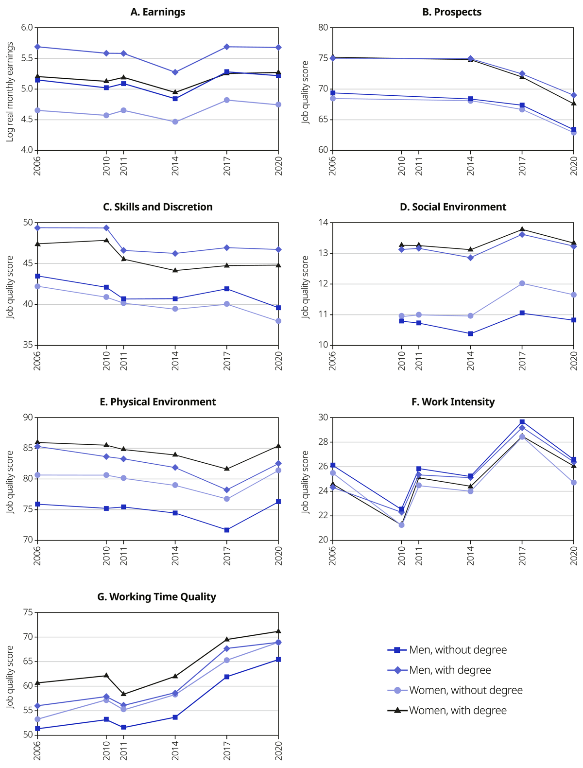 This article deploys the Korean Working Conditions Survey to compile composite indicators of job quality in seven dimensions over time, the same dimensions as those utilized by the European Foundation for the Improvement of Living and Working Conditions (Eurofound). These are Earnings (monthly income from work), Prospects (incorporating both insecurity and career progression), Skills and Discretion, Social Environment, Physical Environment, Working Time Quality and, lastly, a negative indicator – Work Intensity (Eurofound 2012). We use these to document job quality changes between 2006 and 2020, and to examine trends in job quality gaps between men and women, and between university graduates and non-graduates.